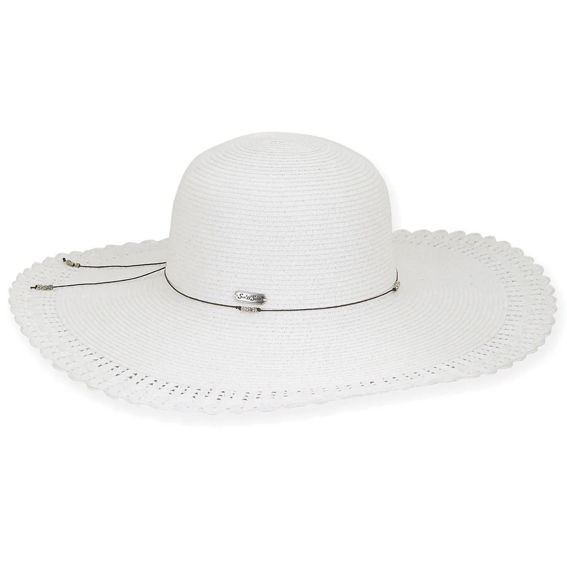 Floppy hat adorned with a thin beaded lariat by SUN ‘N’ SAND is constructed of white paper braid and features a scalloped open-weave design around the brim’s edge. - See more at: