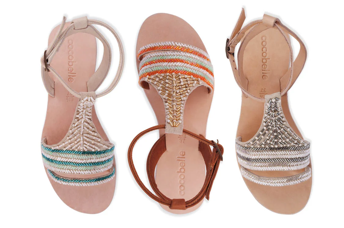 The St. Jean sandal by COCOBELLE links beads in various shapes and sizes in coordinating colors. The embellished upper (shown in “Turquoise,” “Santa Fe” and “Metallic Mix”) with ankle buckle closure has a cushioned leather insole.