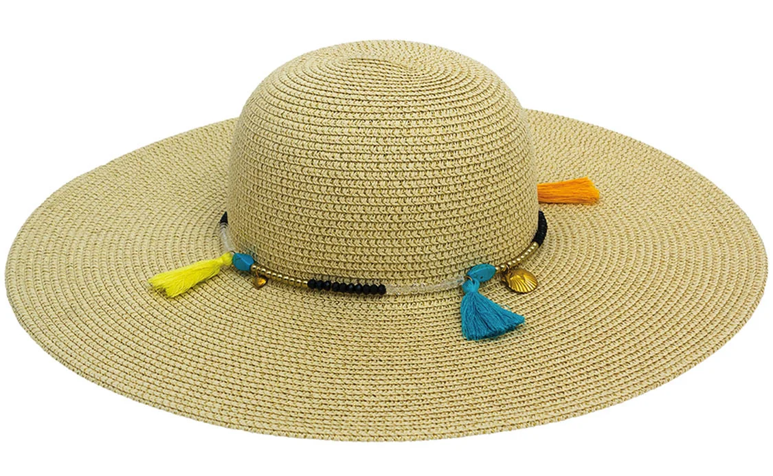 Fun colorful tassels, gold-toned charms and tiny beads encircle a beach-to-street straw hat from MAGID ACCESSORIES.