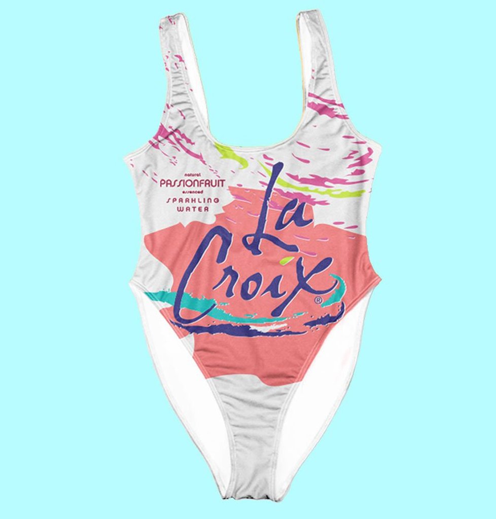 /Nowadays it seems like almost everyone loves LaCroix . . . but do you really love LaCroix? Like, would you get a LaCroix-printed swimsuit? This is not a rhetorical question; I'm honestly asking because these one-piece suits from Public Space actually exist. You can sip your favorite refreshing flavor poolside while wearing it at the same time. This is 2018, you guys.