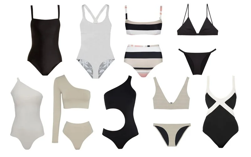 If your style is more minimal, especially at the beach, seamless swimsuits with no ties or frills are your best bet. But maybe step it up a notch and embrace new shapes and patterns in blends of neutral hues. Styles are listed clockwise from the top left.